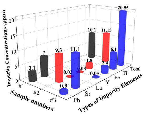 It could be observed that sample #1 has the lowest total impurity content, which contains 10.1 ppm of Sr impurities and Pb impurities. These impurities would reduce the optical absorption and luminescence efficiency of CaF2 crystals and cause the absorption and emission peaks to be red-shifted [29]. Test samples #2 and #3 both contained different quantities of impurities such as Ti, Fe, Y, and La, but the impurity content of sample #3 was greater than that of sample #2. The presence of Pb impurities may have been caused by residual PdF2 deoxidizer, while Ti, Y, and La impurities may have originated from residual CaF2 feedstock. Fe impurities could have been released from iron- or ferro-alloyed materials in the growth equipment under high-temperature conditions. It is worth noting that the rare earth elements Y and La, which have a greater impact on the transmittance of CaF2 crystal, were controlled to below 1 ppm by improving the growth process.