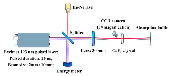 The LIDTs tests at 193 nm were strictly controlled in the LIDT test area for each test sample (as shown in Figure 1), and the corresponding LIDTs of each CaF2 crystal were obtained using the 1-on-1 test method with the same pulse number [30]. The incident laser duration was 20 ns, a lens with a focal length of 300 mm was used for focusing, and the focal spot area was 0.45 mm2. A beam-splitting energy meter was utilized to measure the incident energy during the LIDT tests, and the laser-induced damage characteristics were recorded using a CCD camera (1920 1078 pixels, 5 magnification), as shown in Figure 5. According to the 1-on-1 test method described in [30], CaF2 crystals that exhibit irreversible structural variations upon laser irradiation are considered damaged. A CCD camera with 5× magnification was used to observe whether damage occurred after laser exposure. To determine the LIDTs, different incident fluence levels were applied to separate positions on the CaF2 crystals using a single pulsed laser. By determining the damage probability (damage probability: laser-induced damage number/total irradiation amount) at each fluence level, and applying linear fitting, the laser fluence corresponding to a zero-damage probability was defined as the LIDT for each CaF2 crystal. Additionally, the LIDT was defined as the fluence at which maximum damage was observed in the CaF2 crystals.