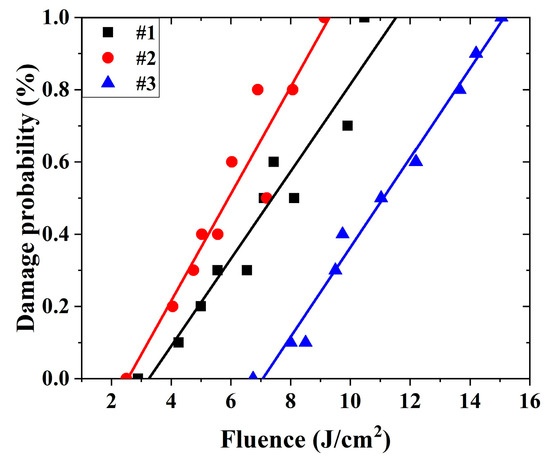 The influence of impurities on the LIDTs at 193 nm of CaF2 crystals was characterized, and the LIDT test results of each sample are shown in Figure 6. The LIDTs of samples #1, #2, and #3 were 3.25 J/cm2, 2.54 J/cm2, and 7.07 J/cm2, respectively, indicating significantly different LIDTs for CaF2 crystals prepared under different growth conditions but with the same processing method. Meanwhile, the relationship between the impurity content of each sample and its corresponding LIDT was established (Table 2). The impurity of sample #3 was higher than samples #1 and #2, yet its LIDT was much higher. This indicated that the impurities in CaF2 crystals are introduced during synthesis and constitute intrinsic defects in the material. Notably, during LIDT testing, the laser does not generate additional impurities. And under trace impurity conditions, the impurity content of CaF2 crystals is no longer the primary factor affecting the LIDT. That is, the intrinsic defects within the CaF2 crystal are not directly correlated with its LIDT. Instead, non-intrinsic defects introduced during surface processing—including both surface and subsurface imperfections—might serve as the primary determinants of the 193 nm LIDT of calcium fluoride crystals. This phenomenon was similarly observed in tests of the fused silica bulk damage threshold, where trace metal impurities exhibited only a weak correlation with the bulk damage threshold [31].
