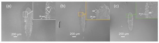 Although the impurity content and LIDTs of three CaF2 crystals were different, the damage morphology of each test sample remained identical, as shown in Figure 7. The damage morphologies of CaF2 crystals observed using Scanning Electron Microscopy (SEM) showed that the initial damage morphology was lamellar stripped cleavage damage, and the flake peeling damage area exhibited an equilateral triangle shape. This was caused by the cleavage plane (111) of CaF2 crystal being easily stripped under laser irradiation. The sliding direction was arranged at a 120° angle on the (111) cleavage plane of the CaF2 crystal. Therefore, equilateral triangular flakes peeled off along the disintegrated surface under the thermal stresses generated by laser irradiation [32]. The depth of the initial damage was approximately 1 μm.