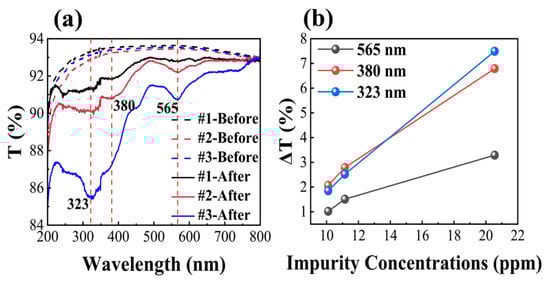 In this study, a UV-VIS-IR spectrophotometer (Cary 5000, Agilent Technologies, Santa Clara, CA, USA) was utilized to characterize the transmission spectra of each test sample before and after 2000 Gy X-ray irradiation. The results, as shown in Figure 8a, reveal that the transmittance of CaF2 crystal across different wavelengths significantly decreased after X-ray irradiation, and three prominent absorption peaks appeared at 323 nm, 380 nm, and 565 nm, respectively. These phenomena were primarily attributed to the formation of color centers during X-ray irradiation [33]. It is worth noticing that due to measurement limitations in the vacuum ultraviolet (VUV) region (190–200 nm), which approaches the lower detection limit of spectrophotometric instruments, significant fluctuations were observed in test results. Moreover, previous studies have demonstrated that X-ray irradiation-induced color centers primarily manifest in the ultraviolet and visible bands. Consequently, this study selected a spectral range of 200–800 nm to analyze the degradation characteristics of CaF2 crystals induced by X-ray irradiation.