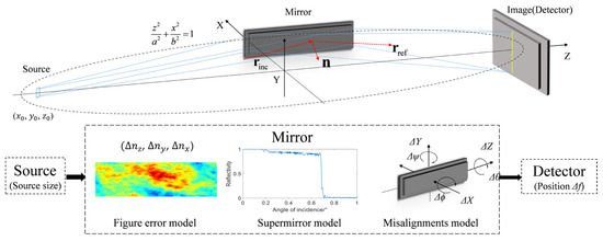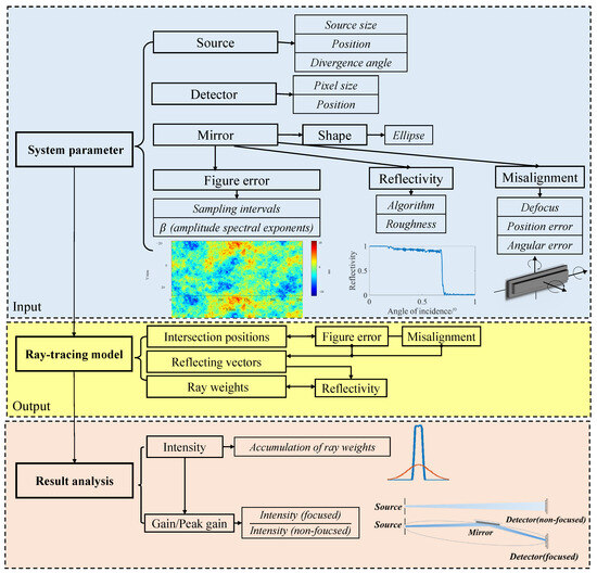 A flowchart of the ray-tracing method. The flowchart consists of three sections: the input of the system parameters (source, detector, and mirror properties such as shape, figure error, reflectivity, and misalignment), the ray-tracing model (the calculation of intersections, reflections, and weights), and result analysis (the intensity distribution at the detector to quantitatively evaluate the focusing gain and peak gain).