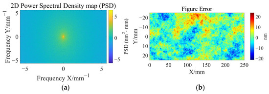 where m and n denote the indexes of the X and Y spatial frequency directions, respectively. The M and N are the numbers of frequencies in the X and Y directions, respectively. φ is the phase angle, which is taken as a random number from −π/2 to π/2. The random surface shows fractal characteristics [25,26], thus the spectral amplitude a(m,n) can be represented by Equation (10). The random figure error can be constructed by converting a random 2D power spectral density (PSD) into the corresponding surface figure error. G(m,n) is a random number, and the β is an exponential controlling the descent of the power spectral density (PSD) curve. Figure 3a is a randomly generated 2D PSD map. Figure 3b shows an example of converting a 2D PSD map into the corresponding surface figure error.