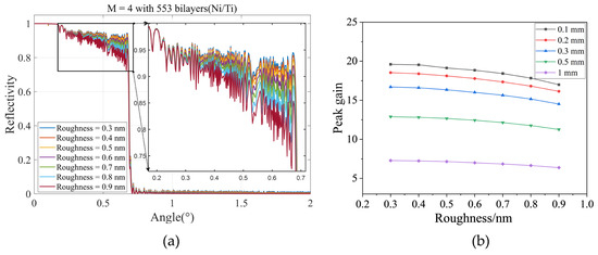Additionally, the reflectivity of the supermirror is highly sensitive to both the surface roughness and the grazing incidence angle. Consequently, the relationship between the grazing incidence angle and reflectivity for different surface roughness values was simulated, as illustrated in Figure 4a. The influence of the surface roughness on peak gain can be observed in Figure 4b. As the surface roughness increases from 0.3 nm to 0.9 nm, the peak gain decreases by 13.3% for the 0.1 mm source and by 12.5% for the 1 mm source.