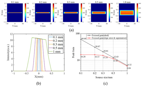 The neutron source was defined by a series of cadmium slits, with slit widths ranging from 0.1 mm to 1 mm in the simulations. The divergence angle of the source is approximately 27 μrad according to the dedicated beamline test. Thus, the simulated rays with divergence angles in a ray-tracing model can be set as the random distribution at the entrance pupil of the slit. To analyze the intensity distribution influenced by the slit width, the slits with different widths have been traced as shown in Figure 5a. When the slit width is small enough, the focusing intensity is an approximately flat distribution. As the slit width increases, the focusing intensity exhibits an asymmetric trapezoidal distribution, as shown in Figure 5b. This asymmetry comes from the combined effects of coma aberration, which broadens the intensity profile, and the larger effective projection area of the lower half of the slit source, which increases the neutron intensity contribution on the negative side of the image plane. The black curve in Figure 5c presents the gain of an ideal surface with different source sizes, while the red curve shows the gain decrease caused by actual surface (60 μrad slope error, 0.5 nm roughness). According to the simulations result, the source size needs to be smaller than 1 mm for a gain larger than 6. The ideal peak gain value decreases approximately linearly as the source size increases, while the smaller source sizes are more easily influenced by the actual surface.
