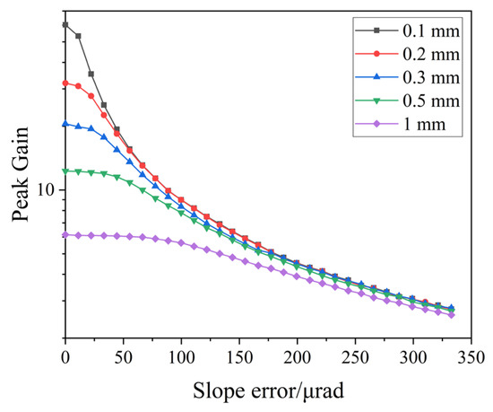 The relationship between slope error and peak gain for five different slit widths (0.1 mm, 0.2 mm, 0.3 mm, 0.5 mm, and 1 mm). The horizontal axis represents the slope error, while the vertical axis represents the peak gain.