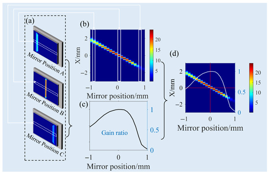 Theoretically, the image plane is set at the geometric focal plane. Figure 8 illustrates the defocus error of the image plane, defined as the positional offset along the positive or negative Z-axis from the focal plane (indicated by the red arrow). The detector positions are typically measured using a tape measure during rough alignment. Therefore, the positional accuracy was set to 1 mm (ranging from −1 mm to 1 mm). The results indicate that defocus error causes negligible effects on the gain, because the gain ratio represented by the white line remains constant.