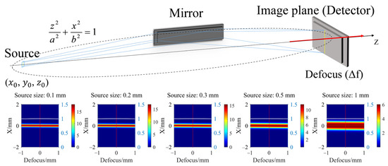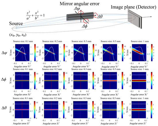 The misalignment errors simulation is based on the positions of the source and detector, with the misalignment errors generated by rotating and moving the mirror around its center. As presented in Table 1, the model includes three positional errors and three rotational errors for the mirror, and the defocus of the image plane. These errors are illustrated in Figure 2. Positional error is defined as the error resulting from the movement of the mirror along a specific axis (ΔZ, ΔY, or ΔX). The angular error refers to the alignment error caused by rotating the mirror around its center. For a given axis of rotation, the rotational matrices Rz(θ), Ry(ψ), and Rx(ϕ) can be written as follows: