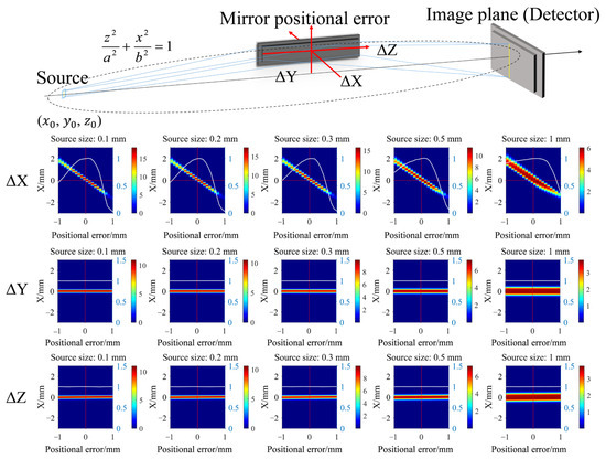 The intensity distribution of reflected rays for different mirror positional errors. ΔX, ΔY, and ΔZ are the positional errors along X, Y, and Z directions, respectively.