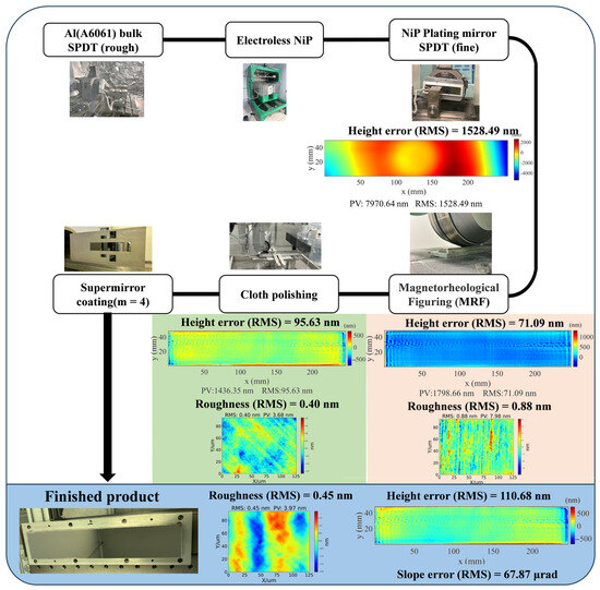 To manufacture a neutron mirror with a peak gain of 6, we conducted an optical design and tolerance analysis as outlined in Section 2 and Section 3. The results of the mirror tolerance analysis are summarized in Table 3. These include maintaining the mirror slope error below 70 μrad, surface roughness below 0.5 nm, positional error along the X-axis within ±1 mm, and angular misalignment (around the Y-axis) within −0.08° to 0.03°. Following the design parameters described in Section 2, an elliptical cylindrical focusing mirror was fabricated, following the manufacturing process illustrated in Figure 11. The aluminum substrates are increasingly preferred due to their superior machinability, radiation resistance, and the electroless nickel–phosphorus (Ni-P) alloy offers the advantage of achieving sub-nanometer surface quality. The substrate is made of aluminum alloy (A6061). Initially, the substrate is rough-formed by single-point diamond turning (SPDT). Subsequently, a 100 μm thick layer of the Ni-P alloy is plated on the cutting surface. The Ni-P alloy layer is suitable to diamond turning and can achieve sub-nanometer roughness after polishing. After nickel plating, slow tool servo machining achieved an initial surface figure error of 1528.49 nm RMS on the elliptical cylindrical substrate, measured by sub-aperture stitching interferometry. Magnetorheological finishing with 0.5 μm diamond powder reduced the error to 71.09 nm RMS and surface roughness to 0.8 nm RMS. Further iterative polishing with a cloth wheel pad and colloidal silica (10 nm particle size) lowered the roughness to 0.4 nm RMS, though the figure error increased to 95.63 nm RMS due to edge effects in polishing. The supermirror (m = 4) was deposited using a magnetron sputtering coating machine, with surface deterioration kept within acceptable limits. The final height error shown in Figure 11 was used for simulations, converted into the slope error to be used in the model for further calculations.