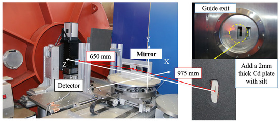 The mirror was mounted on a stacked multi-axis stage for testing as shown in Figure 12. In this test, three cadmium slits (0.1 mm, 0.3 mm, and 1 mm) were placed at the guide exit to serve as the slit source, so that the gain of different slit sizes could be compared. The neutron divergence angle at the guide exit is about 1.57°. The mirror was positioned vertically on the stage. This vertical orientation was selected to be the same as the situation when measuring the surface height error by interferometry, ensuring consistency in the surface figure error. Additionally, the horizontal rotation stage of the sample was centered with the mirror to avoid errors caused by the rotation radius of the rotation stage.