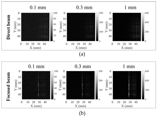 The 2D image on the CCD: (a) the direct beam; (b) the focused beam for three cadmium slit widths (0.1 mm, 0.3 mm, and 1 mm), respectively.