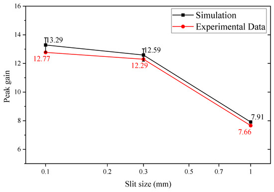 This parameter was incorporated into the simulations, and the resulting gain plot is presented in Figure 14. For the smallest slit width of 0.1 mm, the peak gain was highest in all conditions with 13.29 in simulations and 12.77 in experimental data. As the slit width increased to 0.3 mm, the peak gain reduced to 12.59 in simulations and 12.29 in experimental data. At the largest slit width of 1 mm, the peak gain further dropped to 7.91 for simulations and 7.66 for the experimental data. The gain values obtained from the calculations demonstrate a consistent trend as illustrated in Figure 14. For slit widths of 0.1 mm, 0.3 mm, and 1 mm, the standard error of the rotation stage accuracy in the simulations was 0.50, 0.43, and 0.06, respectively. The relative errors between the experiment and the simulations were 3.9%, 2.4%, and 3.2% for 0.1 mm, 0.3 mm, and 1 mm slits, respectively.