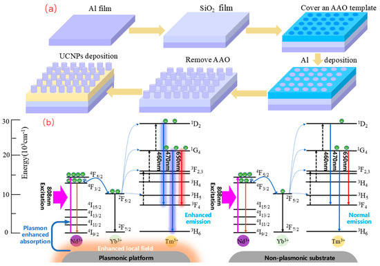 (a) Fabrication flowchart of the aluminum nanoplasmonic structure; (b) Plasmon-enhanced upconversion mechanism.