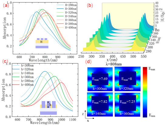 The Al pillar height (h) can also be effective in tuning the absorption spectra. Here, we changed the pillar height from 300 to 400 nm with a step of 20 nm while keeping the other parameters constant. As the pillar height (h) increased, the absorption peak redshifted and the efficiency weakened, as shown in Figure 3c. Notably, when h reached 320 nm, the absorption peak was precisely located at 808 nm. This can be explained by the SPR mode in the Al pillar. As the pillar height (h) increases, the aspect ratio (i.e., the ratio of height to diameter) of the pillar also increases [42,43,44]. This lengthens the oscillation path of electrons in the height direction, thereby reducing the resonance frequency of the longitudinal SPR. To visually demonstrate this effect, Figure 3d showed the field distribution in the x–z plane at the 808 nm wavelength for different pillar heights (h = 300 nm, 320 nm, 340 nm, and 360 nm). Notably, when h = 320 nm, the local electric field at this wavelength reached a maximum value of |E/E0|ₘₐₓ = 8, indicating a significant local field enhancement.