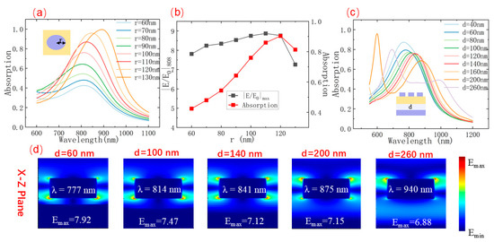(a) Absorption spectra with varying pillar radius r (60–130 nm); (b) correlation between absorption efficiency and maximum normalized electric field strength ∣E/E0∣ at λ = 808 nm with varying r; (c) absorption spectra with varying SiO2 cavity depth d (40–260 nm); (d) local electric field intensity ∣E/E0∣ in the x–y planes across selected wavelengths with d varying from 60 nm to 260 nm.