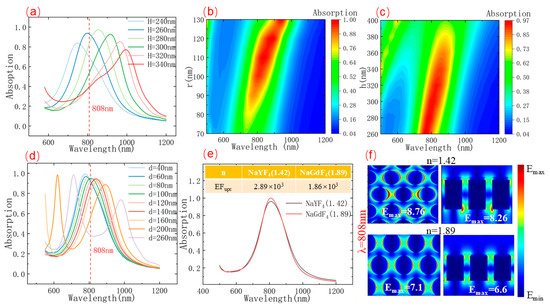 This plasmonic platform is not only suitable for the above non-magnetic UCNPs (NaYF4 host) but also extended to application with magnetic matrix NaGdF4-based UCNPs. Here, the refractive index of typical magnetic UCNPs with a NaGdF4 host was chosen to be n = 1.89 [46]. When the UCNPs matrix material was replaced with magnetic NaGdF4, under fixed parameters (SiO2 layer depth d = 100 nm, Al pillar radius r = 100 nm, height h = 300 nm), while the UCNPs layer height H increased from 240 nm to 360 nm, a similar spectra evolution can be observed (Figure 5a). And the absorption peak continuously redshifts as H increases, while the peak intensity shows a non-monotonic change, first increasing and then decreasing. Notably, at H = 263 nm, the absorption peak is located at the 808 nm wavelength, with an absorption peak of 95%. This indicates that the replacement of the matrix material not only affects the absorption peak but also enables the tuning of the SPR wavelength.