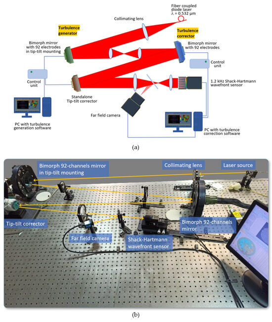 (a) Optical scheme and (b) photo of the complex setup with turbulence generation and turbulence correction modules.