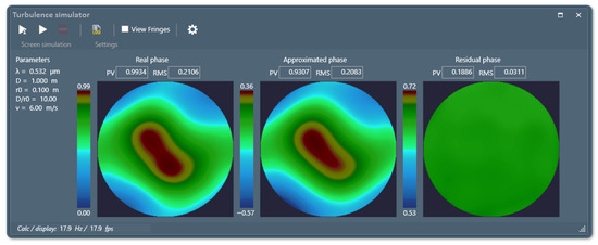 Screenshot of the desktop software tool for a phase screen simulation: from left to right—a simulated phase screen according to Kolmogorov spectra, a phase screen approximated by Zernike polynomials, and a phase difference map.