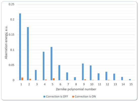 During the continuous correction of induced wavefront distortions, the amplitude of the residual wavefront aberrations ranged from 0.25 to 0.35 μm, whereas the initial amplitude was between 2.5 and 2.8 μm. An example of the wavefront before and after correction is presented in Figure 10.