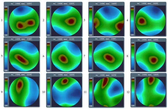 On the other hand, to describe and visualize a wavefront surface analytically, one can use a polynomial approximation, for example, B-splines [81] or Zernike polynomials [82,83,84,85], which are commonly used in optics. Thus, the partial wavefront derivatives ∂W/∂x and ∂W/∂y can be defined analytically using Zernike polynomials: