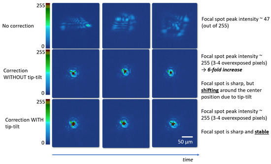 The third row of Figure 11 illustrates images of the focal spot when both correction modules were turned on: the bimorph mirror correcting wavefront distortions while the tip-tilt corrector corrects for tip and tilt aberrations. In this scenario, no shifts of the focal spot within the aperture were observed, resulting in a sharp and stable focal spot.