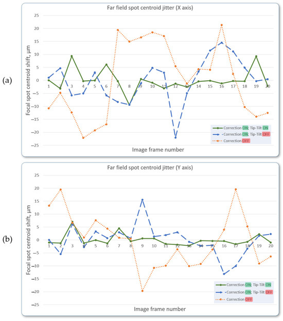 Figure 12 depicts the jitter curves of the centroid of the far field focal spot prior to correction, during correction with the bimorph mirror alone, and with both the bimorph mirror and the tip-tilt corrector operating in tandem. The frequency of the turbulent phase screen reproduction by the turbulence generator was set to 20 Hz.