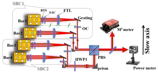 Figure 1 shows a schematic diagram of the experimental setup. This setup included four diode laser arrays (Bar1, Bar2, Bar3, and Bar4), and each array was collimated by a BTS and a slow-axis cylindrical mirror (SAC). The system also included five half-wave plates (HWPs), four Fourier transform lenses (FTLs), four 1st-order blazed gratings, four external-cavity output couplers (OC), five prisms, and PBC. To preserve the diffraction efficiency of the grating, we inserted an HWP (not shown in Figure 1) behind each collimated bar. The BTS consisted of a cylindrical lens and a Dove prism array that matched the period of the emitters in the laser array. The lasers emitted from the laser diodes were collimated by a cylindrical lens in the fast axis, and then the fast and slow axes were swapped by the Dove prism array so as to reduce the influence of the smile effect on the SBC.