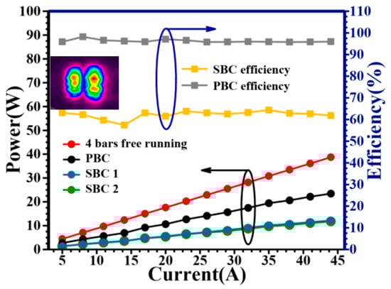 Figure 2 illustrates the output power of the four bars of SBC1, SBC2, and PBC under free-running operation. At a current of 44A, each bar delivered nearly 10 W of output power, which resulted in a total output of 38.5 W for the four bars. As the current was increased from 8 A to 44 A, the output power of SBC1 and SBC2 gradually increased, achieving 12.6 W and 11.8 W at 44 A, respectively. Figure 2 shows the combined efficiency of the four SBC configurations and PBC. The combined efficiency of each SBC configuration was approximately 60%, with an average efficiency of 61.8% of the four SBC configurations at maximum current injection. The power of the four SBC configurations was 14.1 W lower than that of the four bars under free-running conditions. We attributed most of the power loss to the grating and OC because of the suboptimal diffraction efficiency and partial reflection. As the power of SBC1 and SBC2 increased, the power of the PBC increased to 23.4 W, with a beam-combining efficiency of approximately 96%. We obtained all these power measurements using an Ophir FL500 power meter at a controlled test temperature of 20 °C.