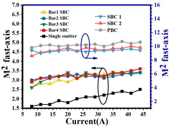 Figure 3 shows the fast-axis beam quality of the single emitter, four SBC configurations, SBC1, SBC2, and PBC, with an injection current ranging from 8 A to 44 A. We determined the beam width of the combined laser according to ISO11146. We measured M2 using Thorlabs M2MS. Figure 3 also shows the detailed beam quality M2 in the fast-axis direction. The fast-axis M2 values of the four SBC configurations increased slowly with an increase in the current and remained close. Under 44 A current injection, the fast-axis M2 of the four SBC configurations was close to 3.5, greater than that of the single emitter. The beam quality degradation was caused by two primary factors: (1) aberrations in the FTL which resulted in incomplete overlap of the beams at the grating, and (2) a smile effect which was induced by thermal dissipation in the bar structure. The fast-axis M2 of SBC1 and SBC2 increased gradually along with the rising current, reaching values of 9.4 and 9.8, respectively, at the maximum injection current of 44 A. The fast-axis M2 of SBC1 exceeded the combined values of SBC bar1 + SBC bar2 by 2.6. Similarly, the fast-axis M2 of SBC2 showed a 2.8 times larger value than the SBC bar3 + SBC bar4. The PBC demonstrated a fast-axis M2 of 10.6, which exceeded those of SBC1 and SBC2 by 1.2 and 0.8, respectively.
