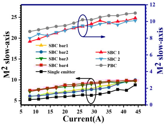 Figure 4 shows the slow-axis beam quality of the single emitter, four SBC configurations, SBC1, SBC2, and PBC, depending on the injection current ranging from 8 A to 44 A. The single emitter laser demonstrated the optimal beam quality, with the M2 factor increasing from 5.3 to 8.8. The deterioration of the slow-axis beam quality was caused predominately by the excitation of higher-order modes under high currents. Among the four SBC configurations, SBC bar 4 demonstrated the worst beam quality, with a slow-axis M2 factor rising from 7.5 to 9.8, which was only marginally higher than that of the single emitter. The slow-axis M2 factor of SBC1 increased from 7.6 to 10.4, and that of SBC2 rose from 8.0 to 10.1. The slow-axis M2 factor of PBC increased from 8.8 to 11. Under maximum current conditions, the slow-axis M2 of PBC was 2.3 higher than that of the single emitter.
