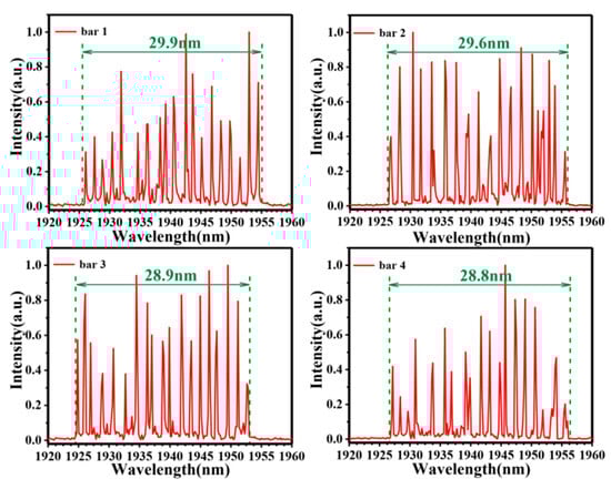The spectral characteristics of the four combined bars were investigated at 40 A, as presented in Figure 5. Each SBC configuration exhibited 19 distinct peaks, with occasional minor subpeaks observed between the primary emission lines. All the SBC configurations demonstrated comparable spectral bandwidths of approximately 29 nm, which were centered around 1940 nm. The external cavity locked all the single emitters, and occasional crosstalk between lasers was observed.