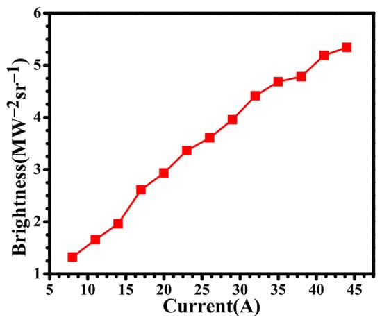 where and represent the beam quality in the slow and fast axes, respectively, P is the output power, and λ is the central wavelength. The brightness of the PBC increased progressively with the rising current, with a maximum value of 5.4 MW·cm−2·sr−1 at 44 A.