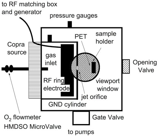 The PASJD process was performed in a suitable designed reactor. A layout of the relevant experimental setup is shown in Figure 1. A general description of the supersonic plasma jet reactor implementation can be found in our previous works [11]. Here the vacuum chamber consists of a stainless-steel cylinder (200 mm height, 300 mm diameter), which is evacuated by a pumping system (turbomolecular pump, Leybold TW250, S = 250 L/s, a zeolites trap and a rotary pump, Varian SD-300), which can be throttled by a CF100 gate valve, so acting as a variable conductance. The plasma source was a commercial radiofrequency source Copra-GTF (97 mm height, 205/245 mm inner/outer radius by CCR technologies) [20]. The source chamber is separated from the deposition chamber by a 4 mm thick plate where a converging nozzle (7 mm end diameter) was drilled. A quartz window allows one to look at the supersonic jet from one side.