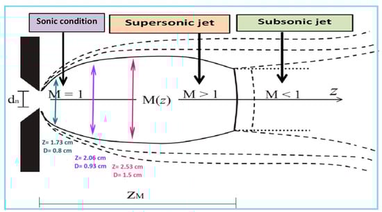 In high pressure systems, where the pressure before the Mach disk is lower than the background value, this shift can cause abrupt recompression, restoring background temperature, pressure and density values. For low-pressure conditions, the transition smoothens. If the gas parameters upstream of the nozzle are known, their values along the centerline of the expansion can be estimated. Analytical formulas for Mach number and pressure in the expansion region were obtained within the isentropic flow framework [32] and plotted in Figure 3a,b, valid for z > dn.
