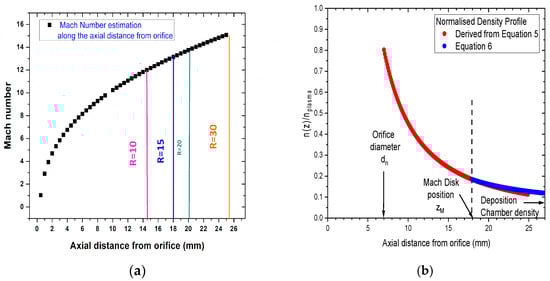 (a) Mach number estimate along the jet axis according to Equation (4). The Mach disk location is indicated by a vertical bar over its position, with R the changing the pressure ratio. (b) Normalized density as a function of the jet axis, estimated according to Equations (5) and (6); the Mach disk is represented by a dashed bar over its position according to our experimental condition.