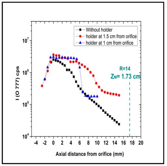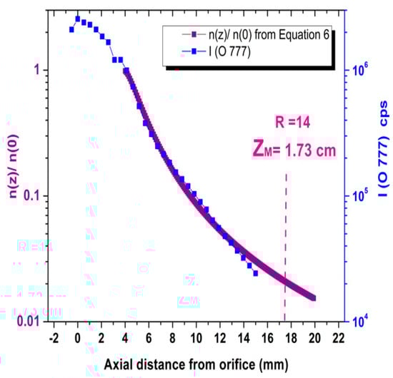 Figure 4 shows a comparison between the experimental measurements for the O 777 nm line intensity and the theoretical results for the oxygen density estimated from Equation (6). For the scale on the right of Figure 4, our experimental condition where a free expanding jet is created, the gas is expanding freely from the orifice into a partially evacuated vessel. So, the gas undergoes a supersonic free jet expansion, as discussed above. So, the molecules are isentropically accelerated, forming a two-dimensional jet structure. The gas thermal energy is quickly converted into fluid flow while the temperature decreases. It is clear that this formula is consistent with our experiment. From Figure 4, as we move 7 mm from the orifice, gas density from the left scale reduces to about one tenth. At 4 mm from the orifice on the right scale, the O 777 nm line intensity decreases more rapidly than theory predicts, showing stronger exponential decay. For atomic/ionic species not in Figure 4, intensity drops where the jet is supersonic, following the isentropic law. This finding aligns with prior research [16] analyzing the axial profile of O2/Ar plasma with a mass spectrometer.