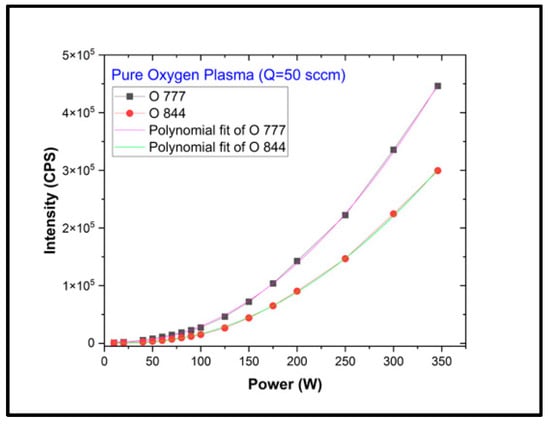 A preliminary analysis was performed collecting the spectra from the plasma region chamber using a fiber optics vacuum feed-through. The spectra embody emissions from a large portion of the plasma, and we have not undertaken the aim to study its uniformity or distribution with respect to the electrodes. More information about the plasma source can be found in our previous works [21]. Quantitative analysis was conducted on the intensity variations of specific emission lines associated with atomic and ion molecular oxygen species present in the plasma, which we discuss more specifically below [37,38,39,40]. In Figure 5 we present the intensities of two atomic oxygen lines as a function of RF power W up to the maximum of 350 W.