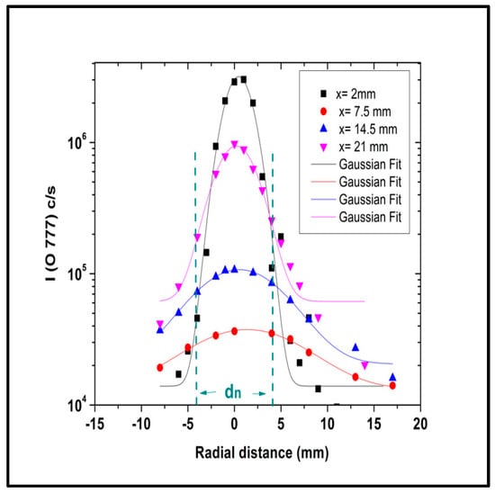 Although the farthest position lies outside the Mach disk location, the plume profile shows little difference, indicating a smooth transition beyond the silence zone. The fitted curves shown in Figure 7 demonstrate that the radial profiles of the O 777 nm emission line intensity exhibit a Gaussian distribution, with highest values aligned to the jet centerline. The profile widths (σ = 2.1, 3.0, 6.5 and 8.7 mm) increase outwards, while their maxima decrease. The literature offered limited insight on the radial profile under these plasma conditions. Based on past research, see Ref. [32], the peak impact pressure outside the shock barrel decreases compared to the centerline pressure. Finally, although data reported in Figure 4, Figure 5, Figure 6 and Figure 7 show the measured counting rate from the spectrometer, it could be possible to translate them into an absolute emissivity value. To this purpose we recall that after calibration, as discussed in Section 2, 1 count/s at 777 nm corresponds to 3.48 nW/m2.s. This is obviously the view-line integrated value. Assuming then a symmetry of the radial profile, for different directions perpendicular to the jet axis, it is possible to extract the emissivity along the axis and its radial profile by techniques such as Abel inversion [31,44].
