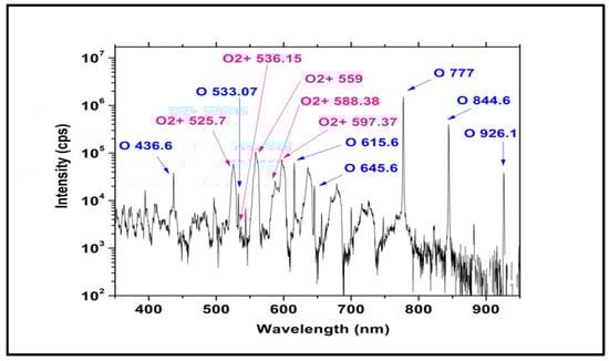 A typical emission spectrum of an oxygen discharge plume (Q = 50 sccm, W = 100 W, R = 14, Pp = 9.7 × 10−2 mbar).