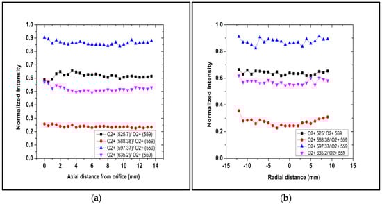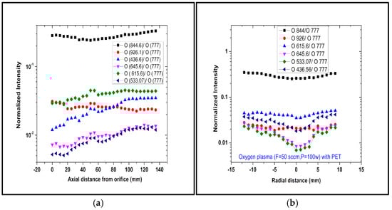 Uncorrected relative weight of the different atomic oxygen lines recorded in the spectra as a function of the plume axial (a) and radial (b) coordinates (Q = 50 sccm, W = 100 W, R = 14, Pp = 9.7 × 10−2 mbar).