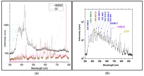 A typical UV/Vis/MIR emission spectrum collected by our OES detection system from a pure HMDSO plasma jet is shown in Figure 11a. This is compared with the spectra from an O2/HMDSO plasma jet, shown in Figure 11b. The former was analyzed to identify the optical active state originating from the monomer dissociation. Discharges in pure from a pure HMDSO are generally poor because of stability and other inefficiencies and are generally mixed with noble gases, such as argon, in viable deposition processes [11]. The whitish weak plume spectrum shows two groups of closely spaced bands merging into an almost continuous emission with two broad maxima. Two strong bands dominate the spectrum, displayed in logarithm scale in the plot (Figure 11a). The strongest is associated with SiOx fragments [38]. The second corresponds to CH radicals. Both features support a view of a strong dissociation of the monomer as it reaches the plume; atomic lines of hydrogen (the Balmer series, here observable up to Hδ) can be distinguished too. Hydrogen abstraction from methyl groups should be its main source. However, their relative intensities could be used to infer information about the electron energy distribution, in particular its high-energy tail [31]. Radiative models for much simpler atoms are quite advanced, because of an interest in thermonuclear fusion research [48,49]. The full identification of the weaker bands is somewhat more complex, also because of some lack of interest in the literature. We positively recognized a few bands that could be ascribed to C2 radicals, which are commonly observed in hydrocarbon discharges [46], and SiH fragments [38]. Although their formation in a nonoxidizing plasma gas phase is not that surprising, their observation supports a picture of strong dissociation and well-developed interaction between the reactive species before they enter the supersonic jet. Again, the relatively short lifetimes of the relevant excited radicals imply that the excitation of radiatively active states has happened practically nearby their observed decays. On the contrary, the OES spectra of the oxygen and Hexamethyldisiloxane plasma exhibit a diverse set of emission peaks corresponding not only to the monomer dissociation but also to the reactions with oxygen. These optical active excited states operate as fingerprints for recognizing plasma-activated species and breakdown components of the HMDSO precursor. The key species found, and their related emission wavelengths, are discussed below. Indeed, the identification of emission lines in Figure 11b is somewhat more complex, as also discussed in the recent literature [50]. In the NIR, the emission peaks at 777 nm, 844 nm and 926 nm are due to atomic oxygen excited states. Their intensity indicates the equilibrium between dissociation of O2 molecules in the plasma and consumption in oxidation reactions with the monomer fragments. Another prominent line is emitted by hydrogen atoms (the Hα Balmer line, seen at 656.3 nm). Its presence is correlated, as in pure HMDSO plasma, to the abstraction of hydrogen from some of the methyl groups (-CH3) in the monomer or its fragments. The almost continuous spectrum in the Visible optical range is composed of closely spaced molecular bands. However, their positions and relative intensities reveal the drastic modification undergone by the plasma gas phase. Their sequence in the 450–600 nm region corresponds to transitions of excited states of CO and CO+, which likely result from the oxidation of the organic components of HMDSO. Different band systems of CO were visible (Angstrom B 1Σ => A 1Π, 3rd Positive b 3Σ => a 3Π, Asundi a’ 3Σ => a 3Π, Triplet d 3Π => a 3Π), whereas only the Comet-Tail system (A 2Π => X 2Σ) was identified for the carbon oxide ion. These features completely mask the C2 and SiO/SiH weaker lines seen in pure HMDSO discharges. A subdominant contribution from molecular oxygen ions could be detected anyways and could be used to study the balance of HMDSO and O2 in the plume plasma, as discussed above. As stated previously, their presence together with the few bands that could be positively assigned to molecular CO⁺ ions (in the blue–violet region of ~420–460 nm) supports a continuous ionization in the plume, producing such ions from parent’s neutral molecules by impact ionization and/or charge exchange reactions in the plasma gas phase.