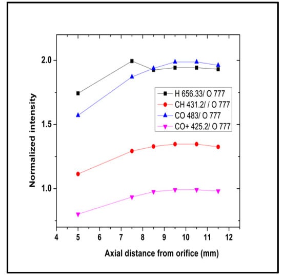 For an insight into the diagnostics capability of OES, we have displayed in Figure 12 the axial profiles of the intensity ratios of a few selected emission lines, uncorrected for instrument sensitivity. As seen in Figure 12, all those ratios increase along the axis, flattening downstream for z > dn. This trend for CO/CO+ points towards continuous oxidation in the initial region of the plume, reducing the relative weight of atomic oxygen states. The same trend for H/CH is more puzzling. It could be ascribed possibly to a greater consumption of oxidizing agents, such as atomic oxygen, along the jet with respect to the level of monomer dissociation, which is tagged by H/CH emission lines. Again, the diagnostic’s potential will be strengthened by a suitable radiative model or at least a framework to evaluate the main excitation patterns.