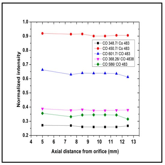 The same approach was shown in Figure 13, but using only excited states from the different band systems of a CO molecule. There, the axial profiles of the intensity ratios of a few selected emission lines, uncorrected for the instrument sensitivity, are displayed. Those ratios, however, remain practically unchanged along the axial profile. This points towards a substantial uniformity in the excitation pattern of such molecules, even if the overall emissivity is strongly depleted as the plasma jet propagates along its axis [46]. As a cross-check the measured ratio between two lines from the same band system was plotted too. Here the (B 1Σ, v = 0 => A 1Π, v’ = 0) and the (B 1Σ, v = 0 => A 1Π, v’ = 1) transitions are compared. Such a ratio is trivially independent from the plasma, as well as the excitation conditions, reflecting only the different branching ratios arising from the Frank–Condon factors of the two bands. The small level of fluctuation, despite the quite pronounced spatial profiles probed, supports the rather robust solidity of our measurements and in general the OES technique.