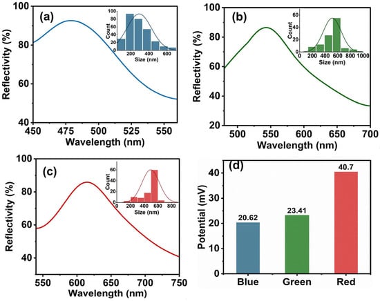 Reflection spectra of photonic crystal nanoparticles composed of formation of the blue structural color of ZnO nanoparticles (a). Reflection spectra of photonic crystal nanoparticles consisting of formation of the green structural color of ZnO nanoparticles (b). Reflection spectra of photonic crystal nanoparticles composed of formation of the red structural color of ZnO nanoparticles (c). The Zeta potential of zinc oxide of different sizes corresponding to photonic crystals of different colors (d).