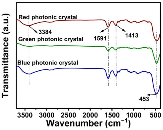 Based on the reflection spectra and calculations derived from the Bragg diffraction expression [36,47,48], the size of ZnO particles that can produce different structural colors was determined, consistent with the constituent unit sizes of the photonic crystal nanoparticles (Figure 2a–c). The redshift in the reflectance peak positions observed in Figure 2 is attributed to the size-dependent quantum confinement effects of the ZnO nanoparticles, where smaller particle sizes correlate with a widening bandgap. This phenomenon aligns with calculations from the Bragg Equation (1),