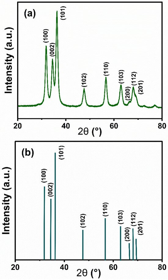 The crystal structure characteristics of the ZnO nanoparticle material can be obtained after resolution of the X-ray diffraction pattern. As shown in Figure 4a, the diffraction spectrum of the sample presents a series of characteristic peaks at 2θ angles of 31.78°, 34.58°, 36.38°, 47.72°, 56.70°, 63.06°, 66.38°, 68.22°, and 69.10°, and the diffraction peak positions of these peaks are similar to those of the hexagonal fibrillar zincite structure ZnO in the standard card (Figure 4b) (100), (002), (101), (102), (110), (103), (200), (112), and (201) crystallographic family diffractions, in perfect agreement. The experimental data indicate that the prepared ZnO nanoparticles have a typical fibrillar zincite crystalline structure, which has been widely confirmed as the most stable form of ZnO in existence. Notably, the narrow half-height width of the diffraction peaks and the good symmetry of the peak shapes reflect that the material is characterized by a highly ordered crystal arrangement. Meanwhile, no characteristic peaks of other heterogeneous phases were found in the detection range, confirming that the product has high phase purity.