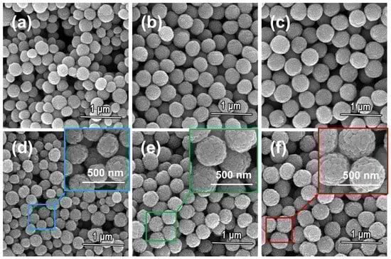 SEM images of zinc oxide photonic crystal nanoparticles: blue photonic crystal nanoparticles (a); green photonic crystal nanoparticles (b); red photonic crystal nanoparticles (c); blue photonic crystal nanoparticles after sintering (d); green photonic crystal nanoparticles after sintering (e); red photonic crystal nanoparticles after sintering (f).