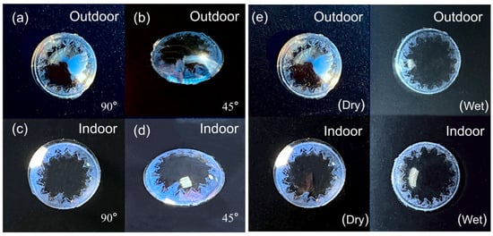 Effects of lenses under sunlight conditions at 90° (a); effects of lenses under sunlight conditions at 45° (b); effects of lenses under artificial light at 90° (c); effects of lenses under artificial light at 45° (d); effects of dry and wet lenses under different light sources at 90° (e).