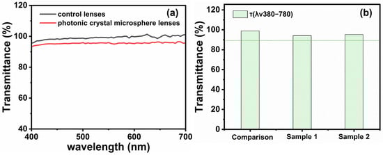 Light transmittance is a crucial parameter for assessing the optical performance of contact lenses, directly affecting the visual clarity and comfort of wearers. Regulatory compliance verification protocols specify a minimum 89% optical transparency threshold for ophthalmic prosthetics [28]. Dual-axis photometric evaluation revealed that ZnO photonic nanostructured ocular devices achieved 94.61% mean luminous transmission values, compared with 98.78% for conventional reference samples (Figure 7a,b). Both values significantly exceeded the standard requirement, indicating that ZnO photonic crystal nanoparticle contact lenses exhibit excellent optical transparency, providing wearers with clear vision and a comfortable wearing experience. High transmittance not only enhances visual correction, but also reduces eye fatigue.